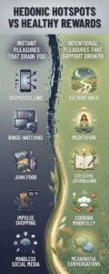 In everyday life, we can highlight the phrase hedonic hotspots as a helpful metaphor. A phone on the bed can become a hedonic hotspot. A kitchen full of short eats and easy snacks can become a hedonic hotspot. Endless entertainment, endless scrolling down, one-click shopping, gossip, comfort eating, and constant checking can all act like little pleasure magnets in daily life. But we must keep in mind that they are not evil. Pleasure is not evil. Rest is not evil. Enjoyment is part of being human. And we must get rest in the meantime. But the problem begins when our whole life becomes organized around short-term relief instead of long-term meaning. Then our days start to drift. We become busy but not fulfilled, stimulated but not peaceful, occupied but not growing.